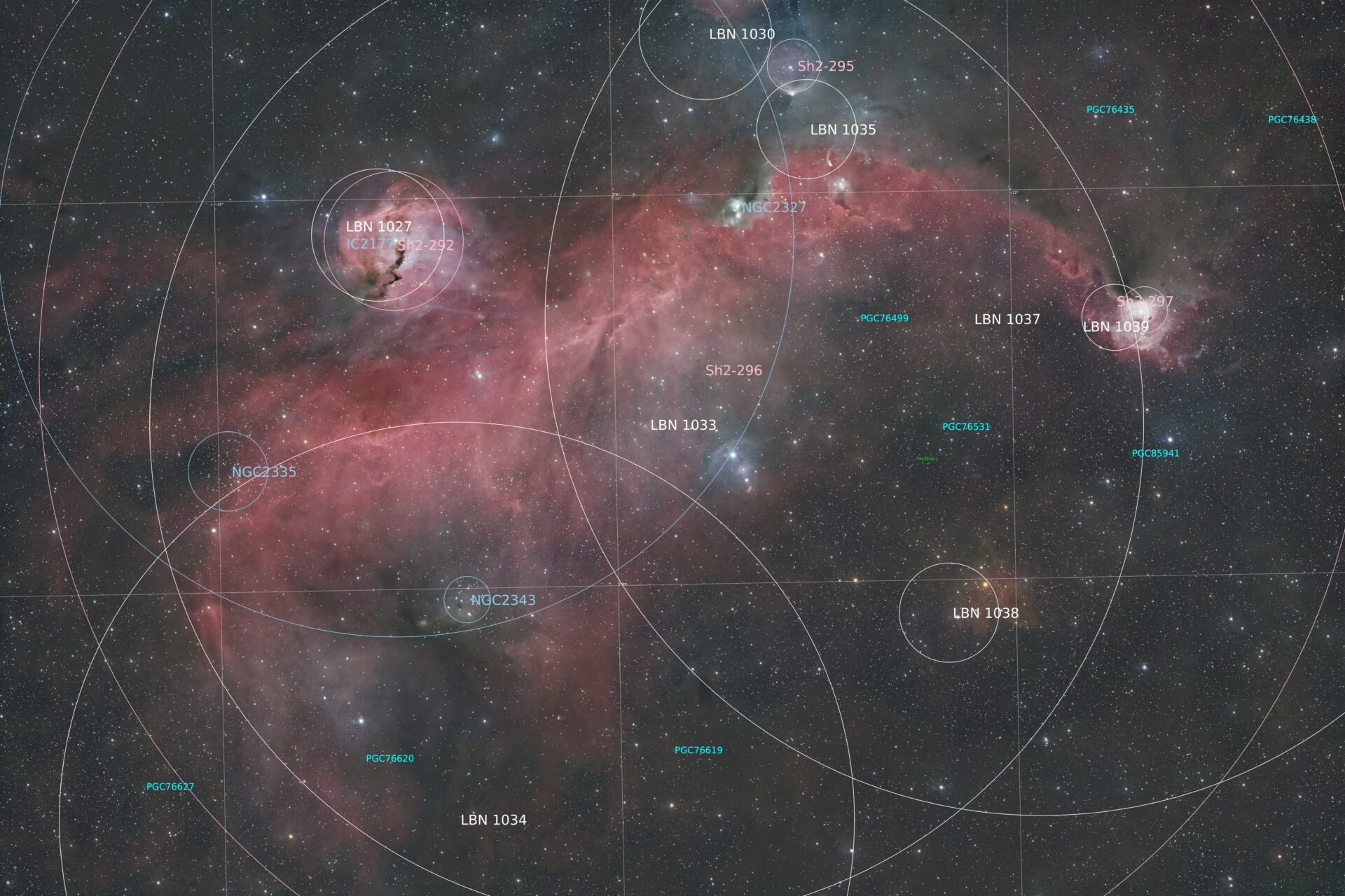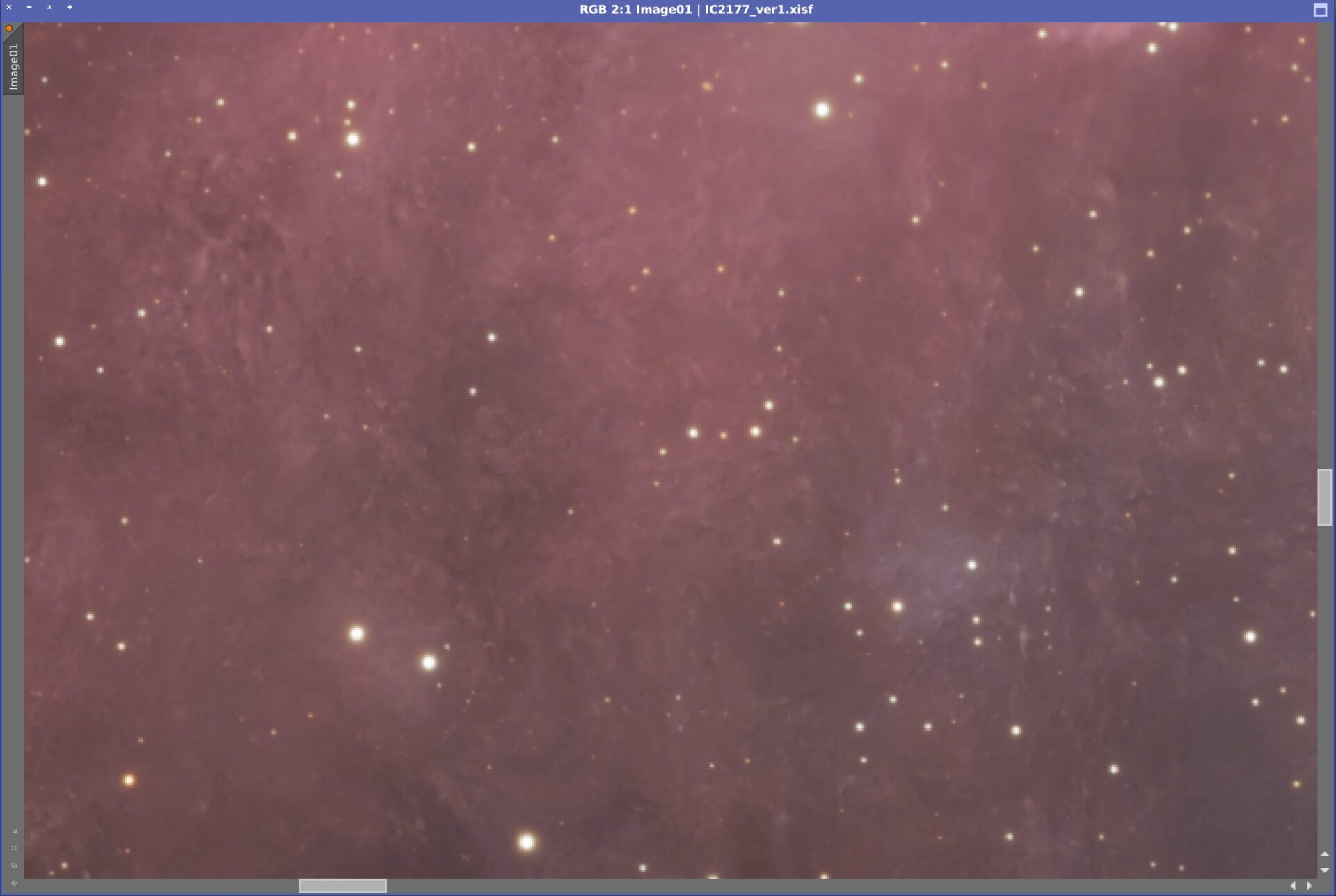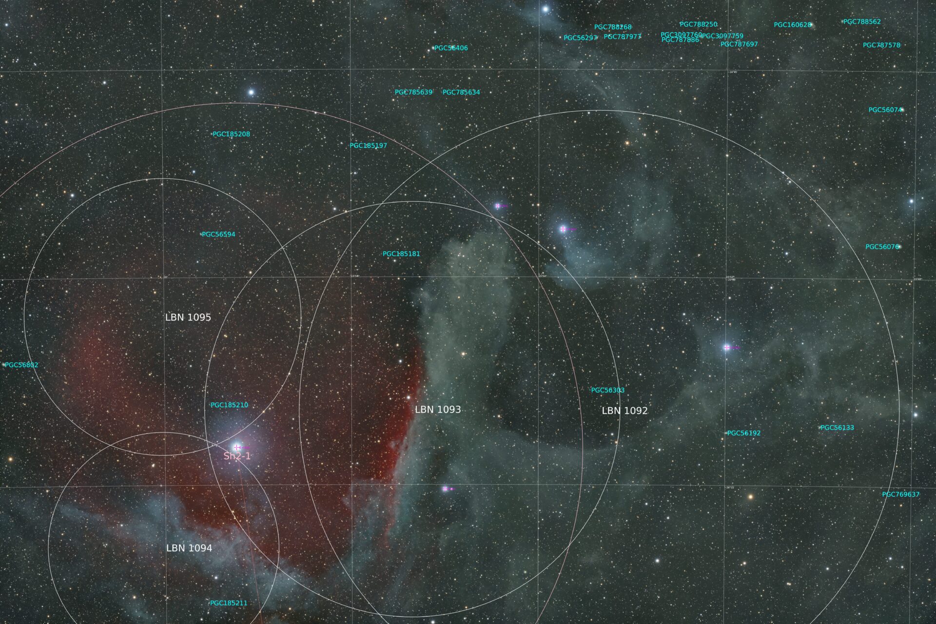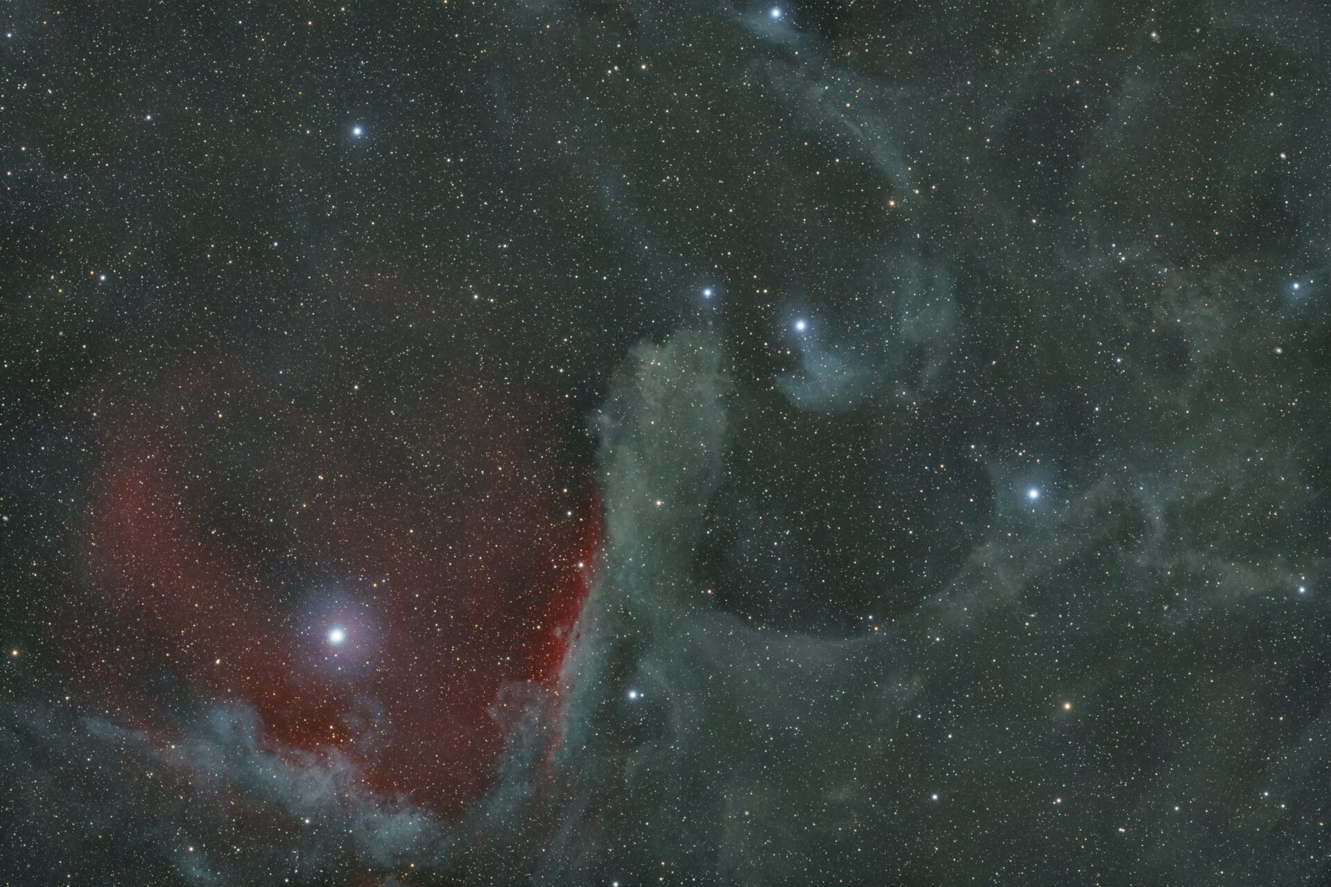 反射星雲の淡い青と、Ha領域の赤が重なり合い、立体感がとても美しい星雲です。