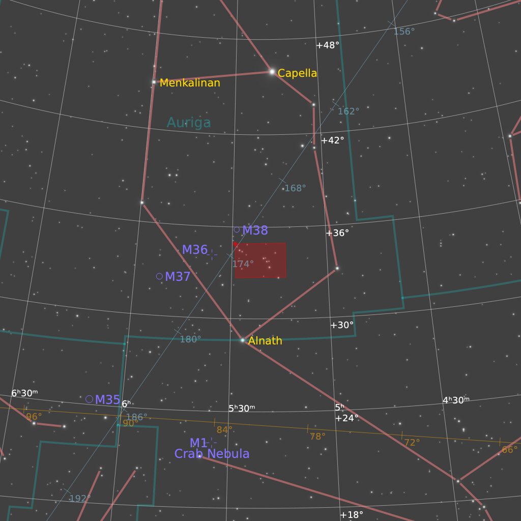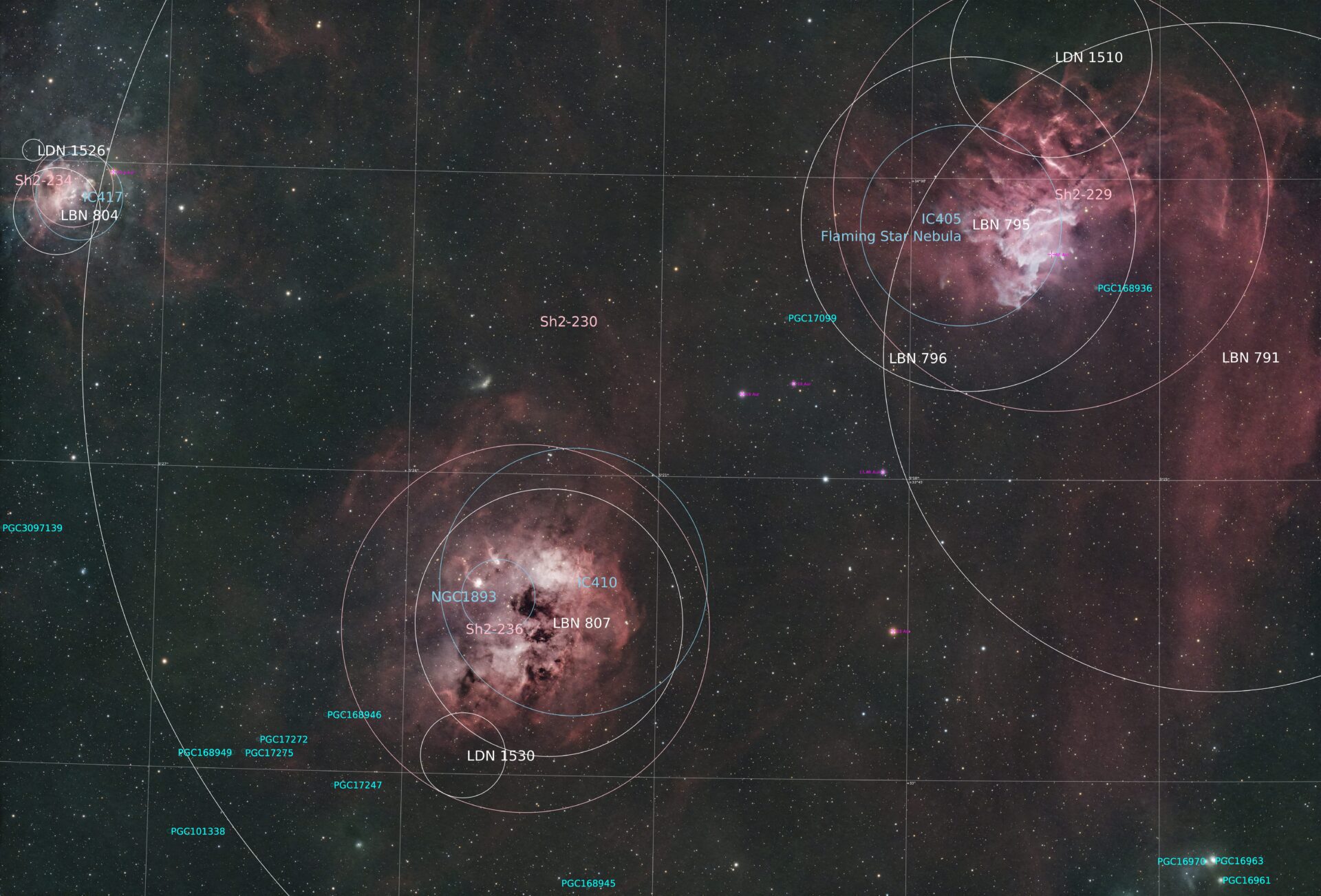 今回撮影した領域は、ぎょしゃ座の代表的な散光星雲が集まる、とても賑やかなエリアです。