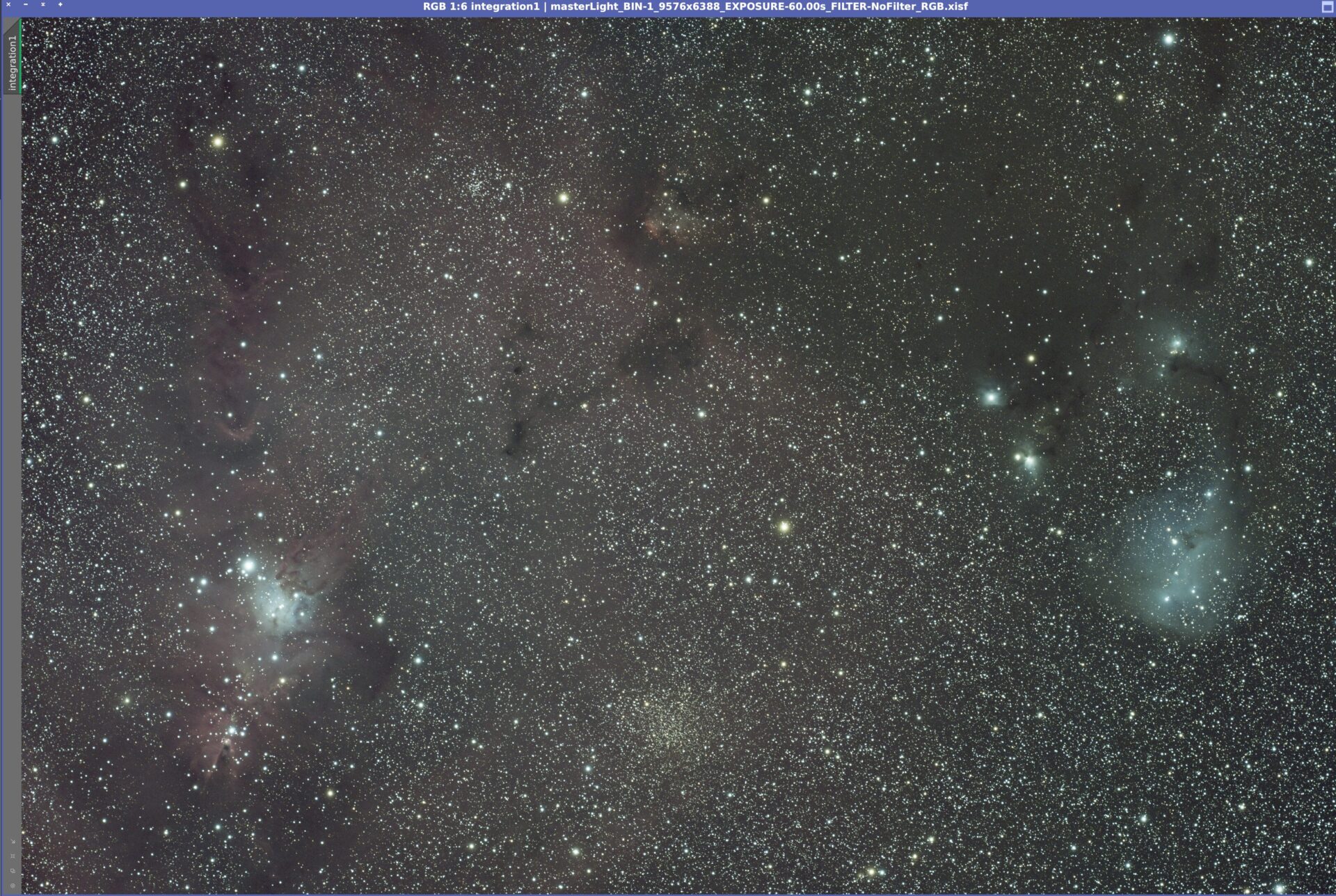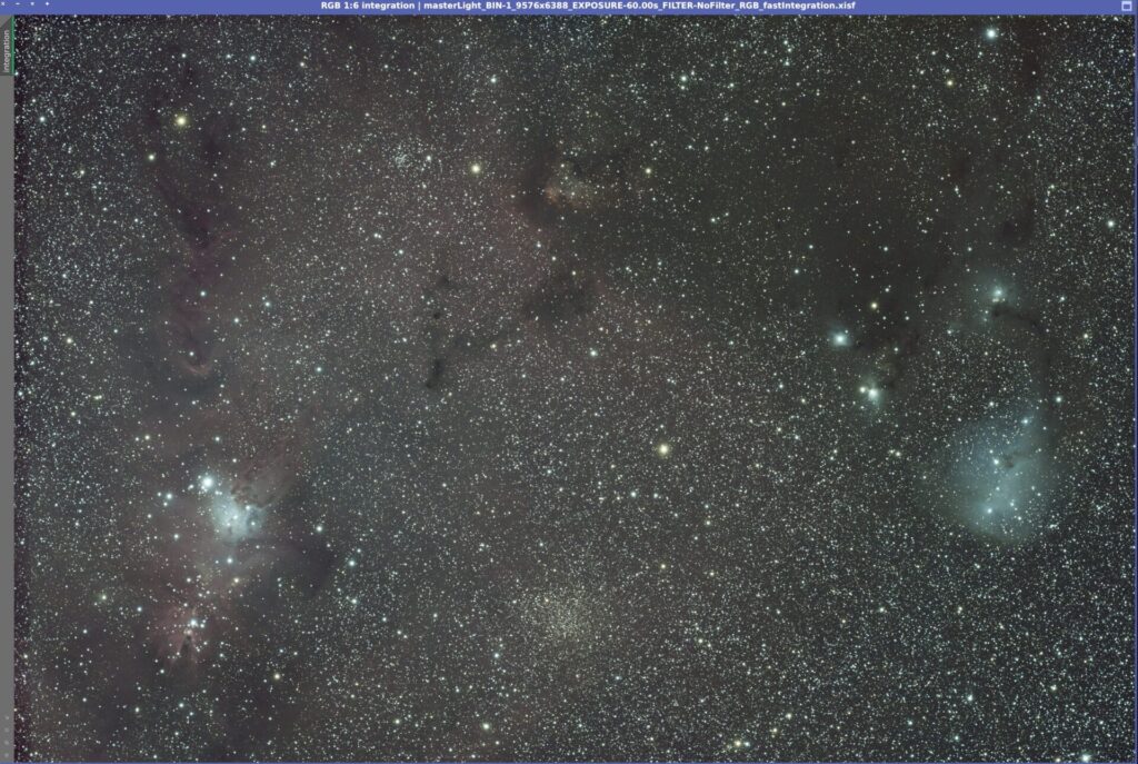 今回の観測は、天頂付近を通るクリスマスツリー星団とかたつむり星雲を選んだのは、雲の流れを読みながら少しでも良い条件を掴みたかったからなんです。14日にはすでにWBPPで下処理を終えていたものの、思いがけないPixInsightのバージョンアップが入り、撮影フレームの選別が驚くほど簡単になるという朗報が舞い込みました。さっそく新機能を使って処理をやり直してみると、薄雲が通過したときに残りがちな星回りのハロが見事になくなり、仕上がりの美しさに思わず「これは本当に使える機能だ」と感じる結果となりました。今回のアップデートは、自分の天体撮影のクオリティをさらに押し上げてくれる、嬉しい進化になりそうです。