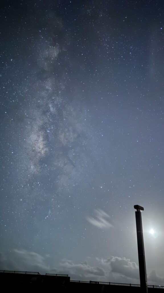 宮古島の夜は、まだ夏の名残をたっぷり残している。昼間に熱せられたアスファルトや海風がまとわりつくように湿気を運び、肌にじっとりとまとわりつく。三脚を立てただけで額に汗がにじみ、南から吹き抜ける風がそれを少しだけ冷ましてくれる。