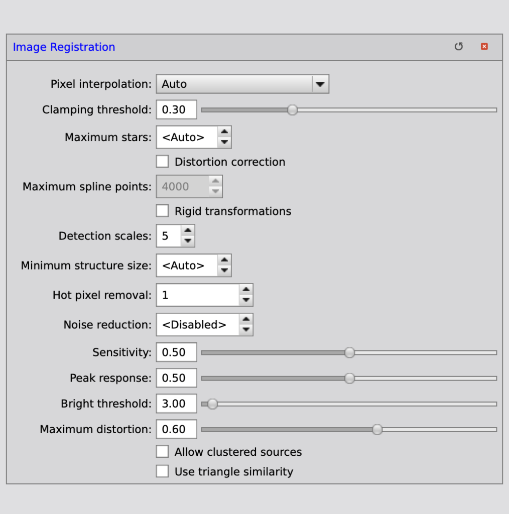 | Pixel interpolation | Auto | 位置合わせ時の画素補間方式を指定 | Auto推奨。WBPPが最適な補間方式を自動選択 |