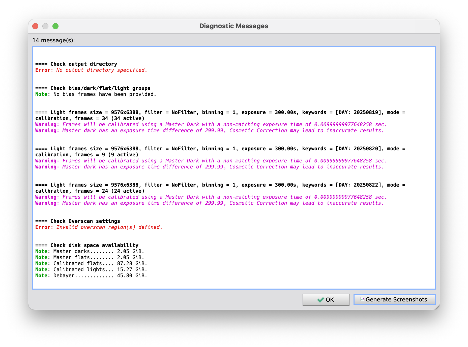 ⚠️ WarningMaster Dark の露光時間不一致Light(300秒)と Dark(約0.01秒)が一致していないダーク補正が不正確になる可能性同一露光時間のDarkを用意、またはDark設定を見直す