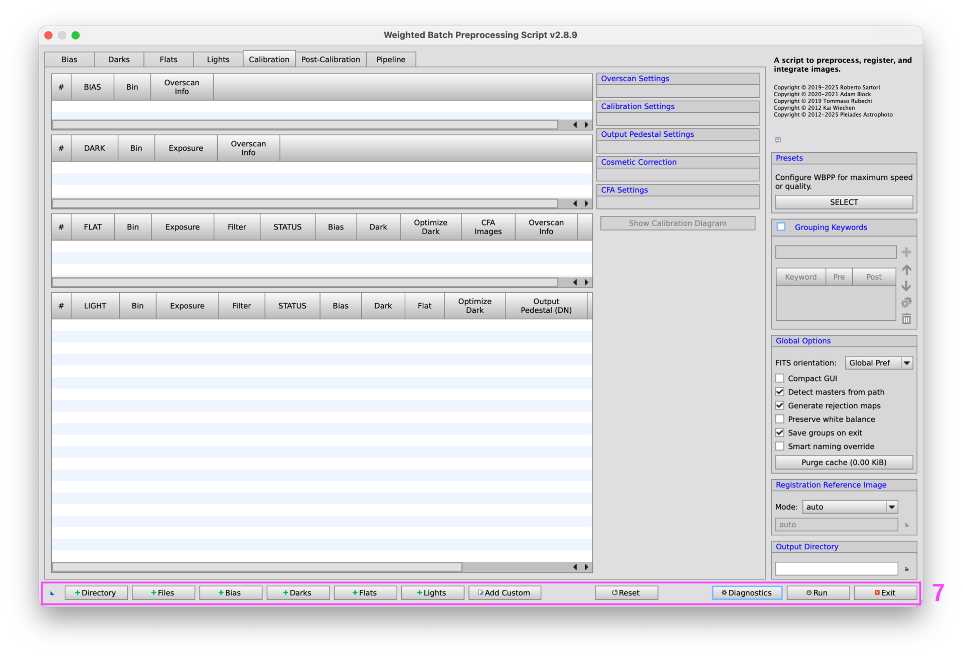 WBPP画面の最下部に並ぶボタン群は、WBPPを実際に動かすための操作エリア です。