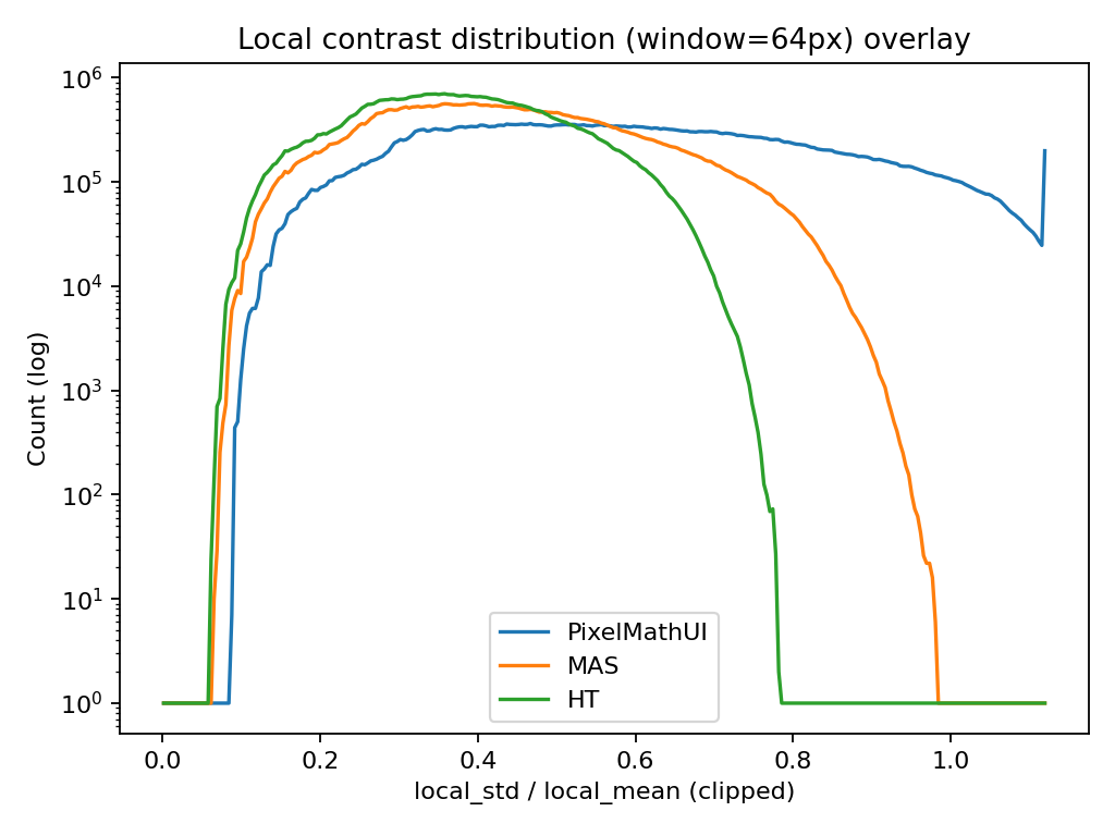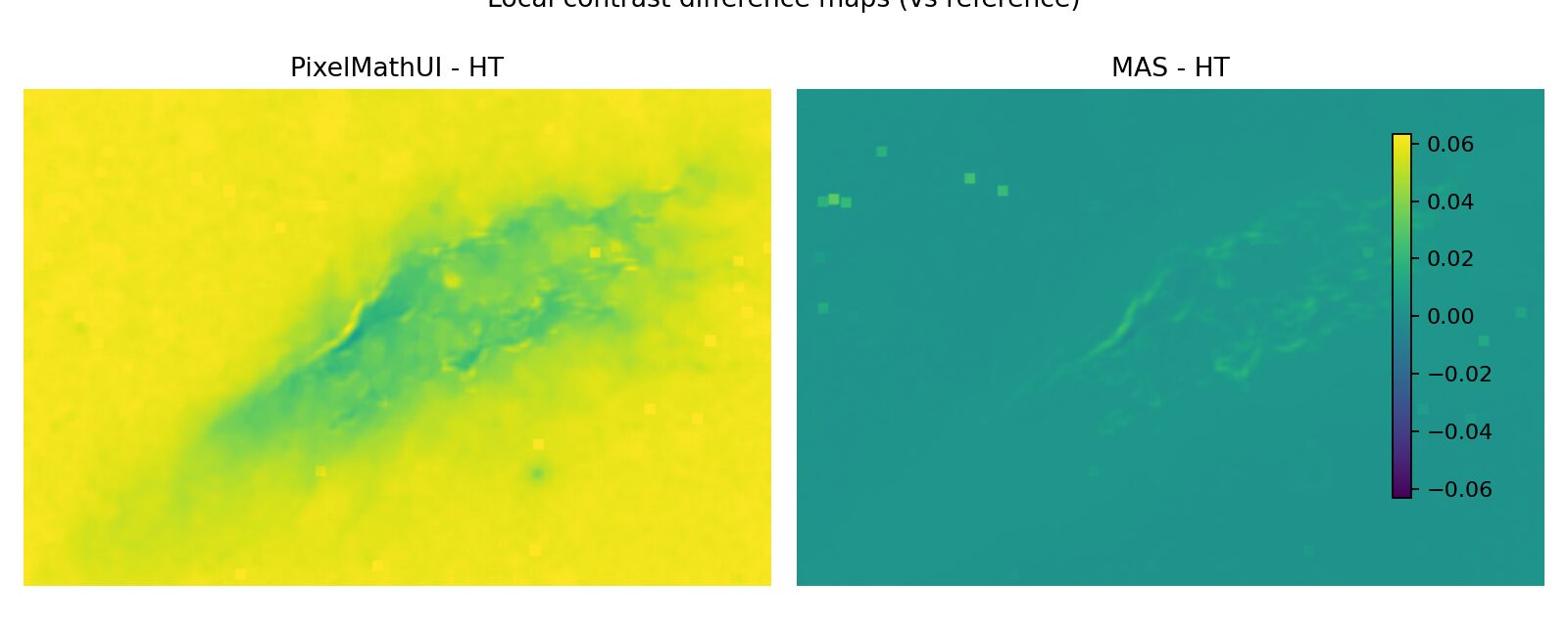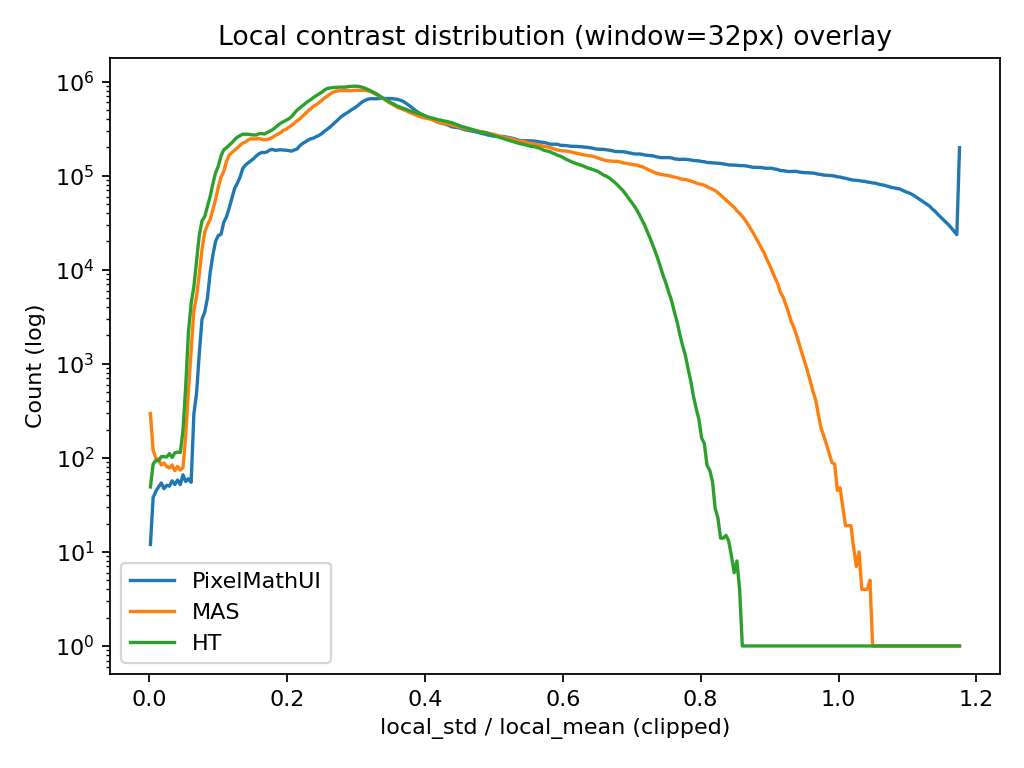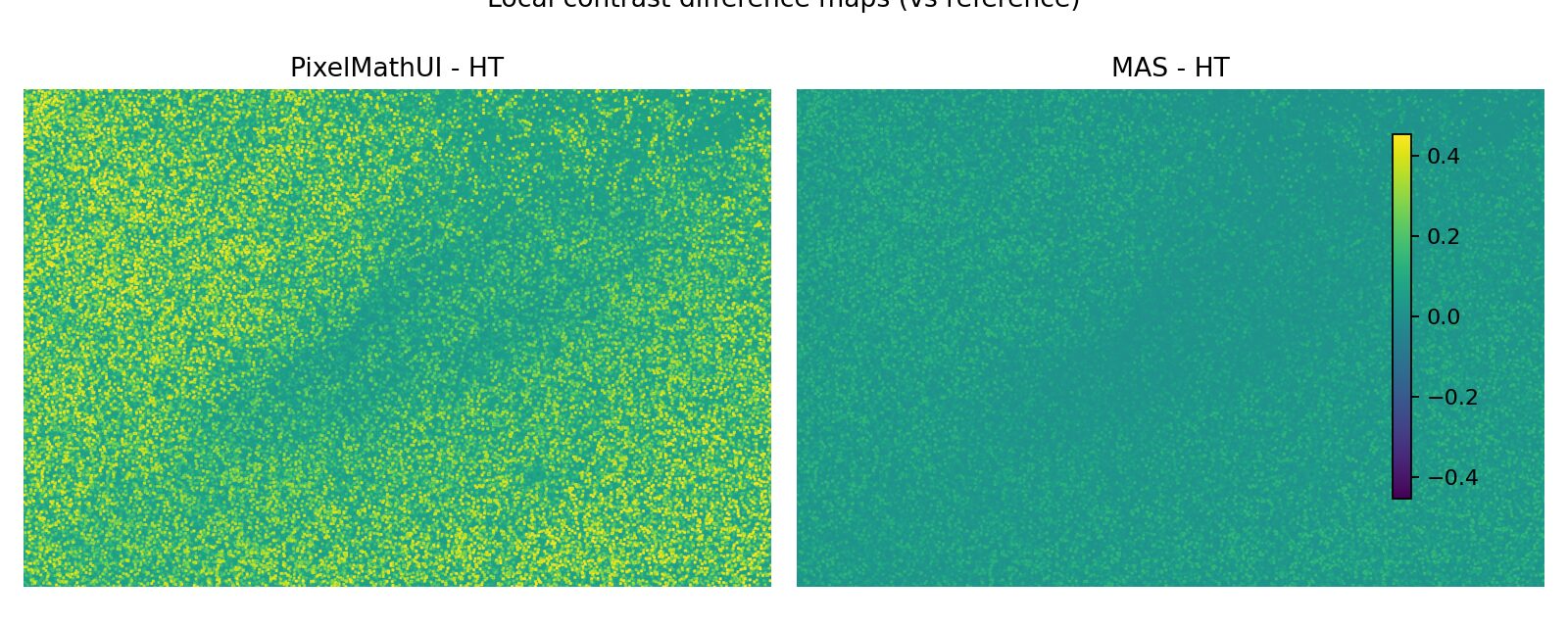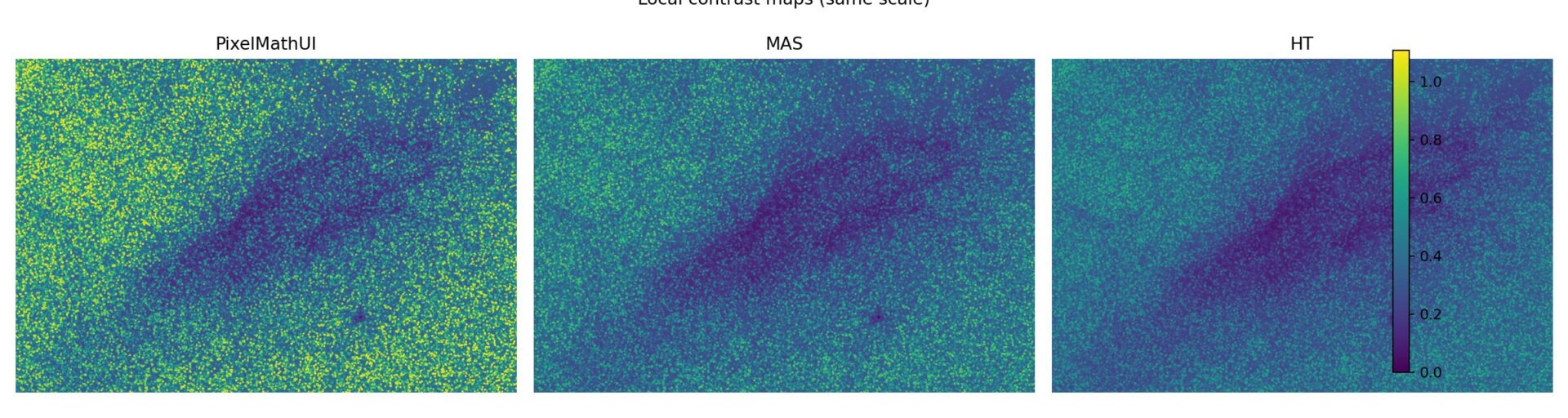 PixelMathUI だけが局所コントラストを積極的に押し上げる。