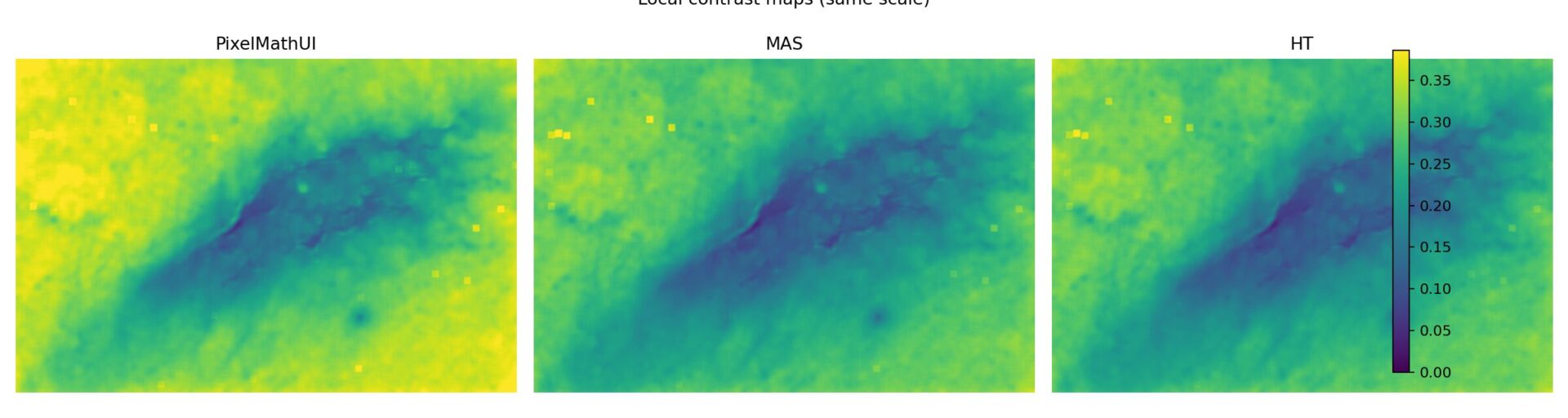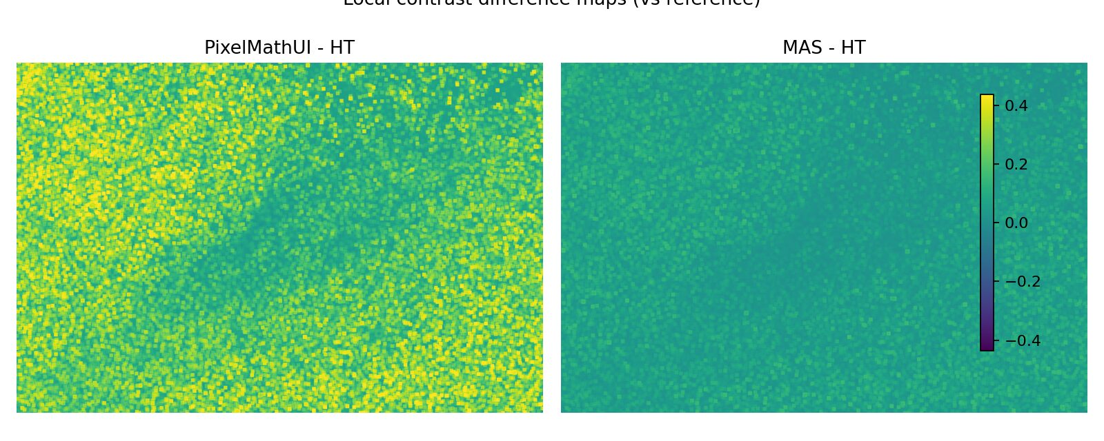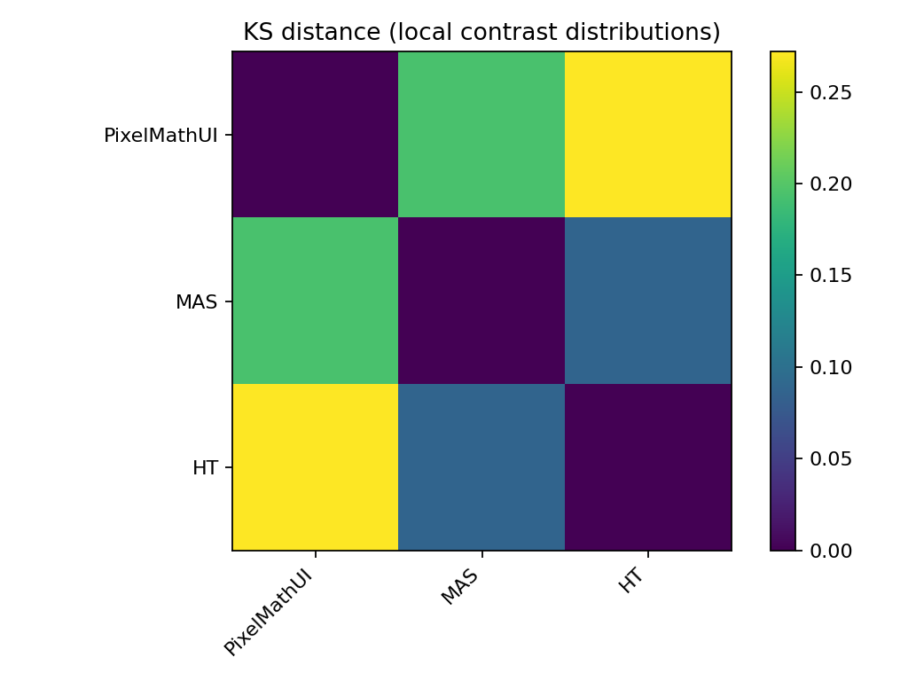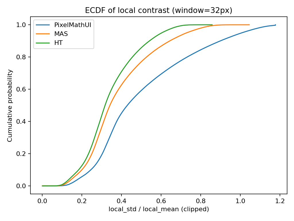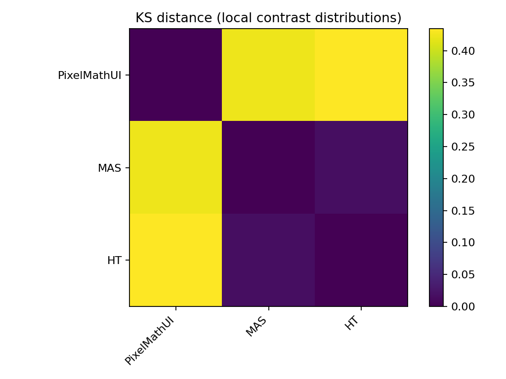 PixelMathUI だけが局所コントラストを積極的に押し上げる。